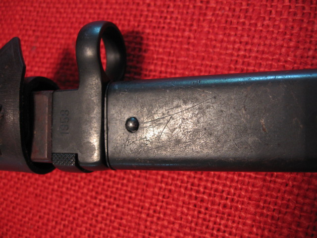 I wouldn't even want to guess which finish, (Bluing, Phosphate, or Paint), is rarest on any of the 1958s or 1970s. I would guess the one(s) that a collector doesn't have would be the rarest one(s). I do not have a 1957. They appear to be blued in pictures, is this correct and the only finish found? The finishes seem to be random on the 1958s. On the 1970s, the earliest ones seem to be blued, (old style sewn hanger) the phosphate came next, (low 4 digit number and later style riveted hanger. The black painted one was last produced, (5 digit number and riveted hanger). I have found references that document that the old style sewn hangers were used when production was resumed with the 1970 version. When existing supplies of the sewn ones were exhausted the newly designed and approve ones with rivets were used. Therefor it is correct for a sewn hanger to be on a 1970, but the riveted ones should only be considered original on a 1970. Riveted one on a 1957 or 1958 would be as a replacement. Just had a thought, is it possible that the different finishes on the bayonets could be from rework/refinishing? Hard to explain as my 1970s are in like New condition. Mike