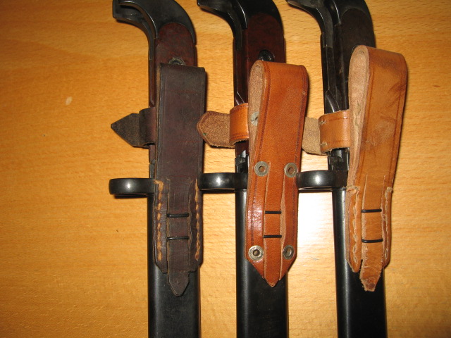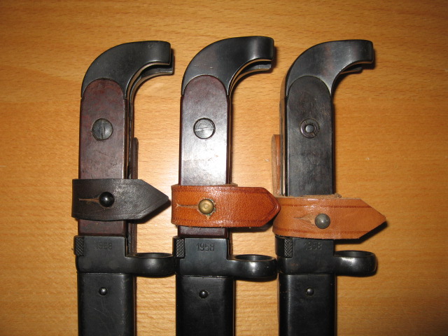 Here are some better pictures of the three finishes found on the 1970 version of the Polish AK47 bayonets and scabbards. They are from top to bottom and left to right: Blued - Phosphate - Painted Black. These same finishes are found on the 1958 series bayonets as well. Mike