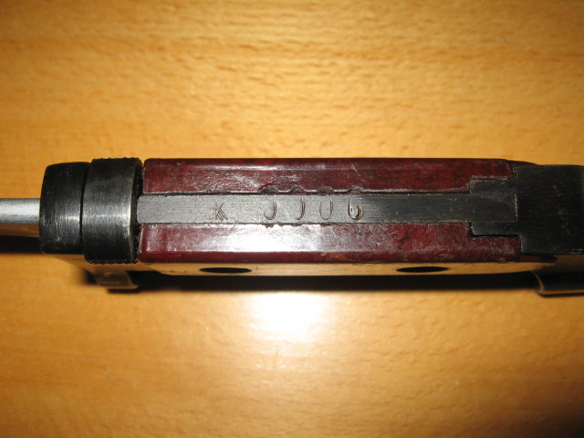 This is an unusual bayonet that I believe to be Polish issued but may not be Polish made. It came with a standard Polish scabbard and hanger and was with a lot of other Polish bayonets. It has no markings other than a serial number, "K" and 5 numbers, in the Polish position on the bottom of the hilt. Note that the dies used to stamp the numbers were too large and caused small chips in the grips. The grip panels themselves appear to be similar to the Polish ones. The final exterior machining on the cross guard and pommel is rougher than the normal smooth Polish ones. Whether this bayonet was supplied by another country, (i.e. Bulgaria?), as a completed item or parts is unknown. Also unknown is if it was pre-Polish production or to supplement Polish production. I have seen pictures of a similar bayonet with the Russian Izhevsk mark on the cross guard of a Polish bayonet as well. Mike