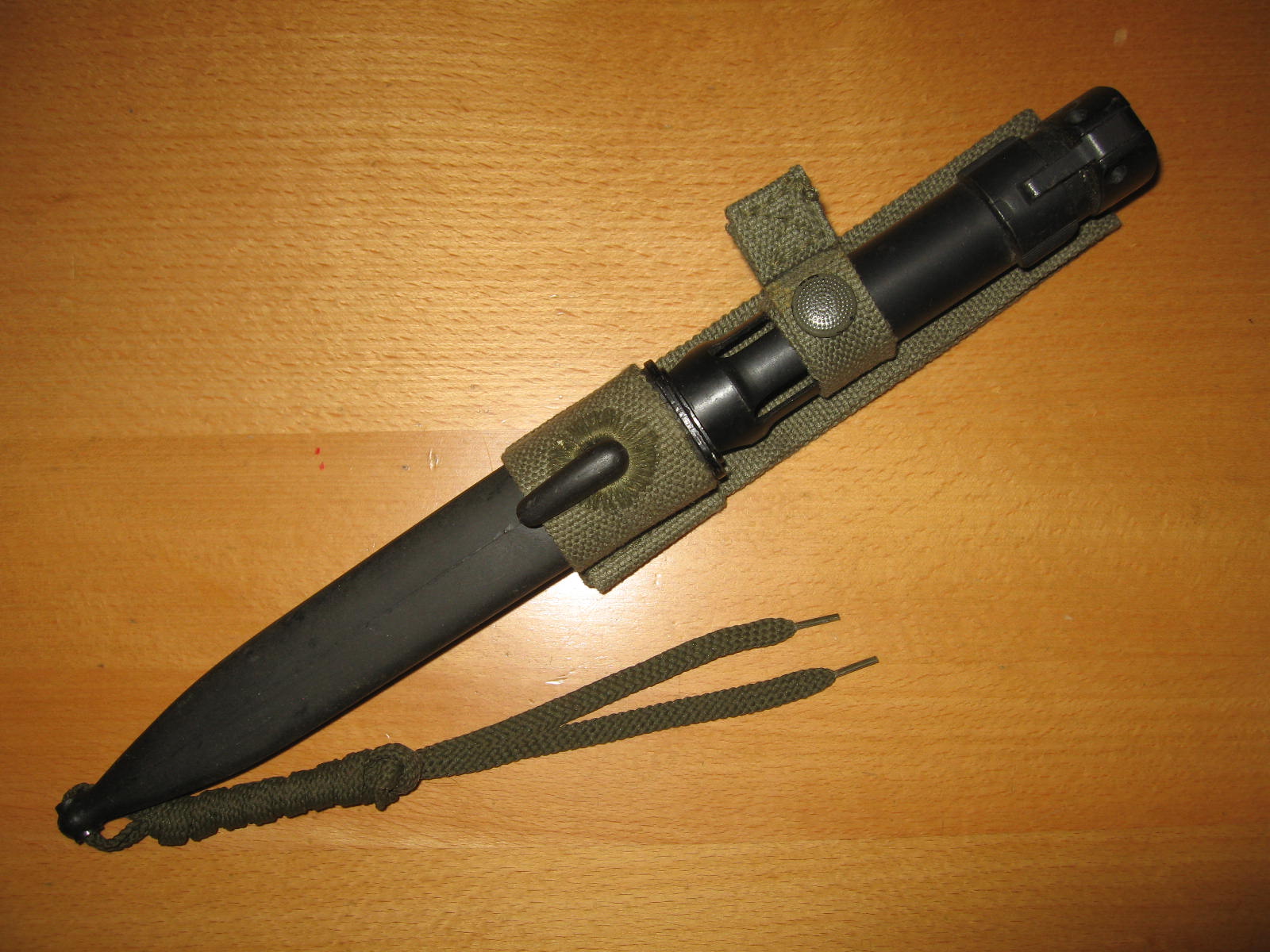 This is a South African R1 bayonet and scabbard. It is for their FN-FAL style weapons. This is the type of bayonet that was modified to fit on the South African Galil/Kalashnikov style R4 rifle. The R4 is featured in Martin Ivie's book "Kalashnikov Bayonets".