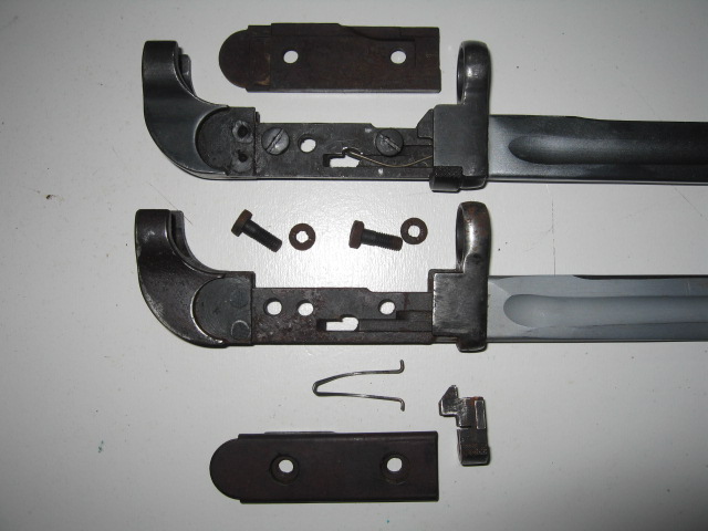 I tend to be analytical and curious and this is what I found when I stripped down a AK47, AKM Type I and II bayonet. I used rough, damaged non matching bayonets. I stop short of drilling or punching metal rivets on the pommels and cross guards as I felt nothing more would be revealed. I was surprised that the pin securing the grip to the blade tang on the Type II was plastic!? I had expected a machine screw and nut like on the Type I. If any one is interested in more details or close up pictures let me know. Mike