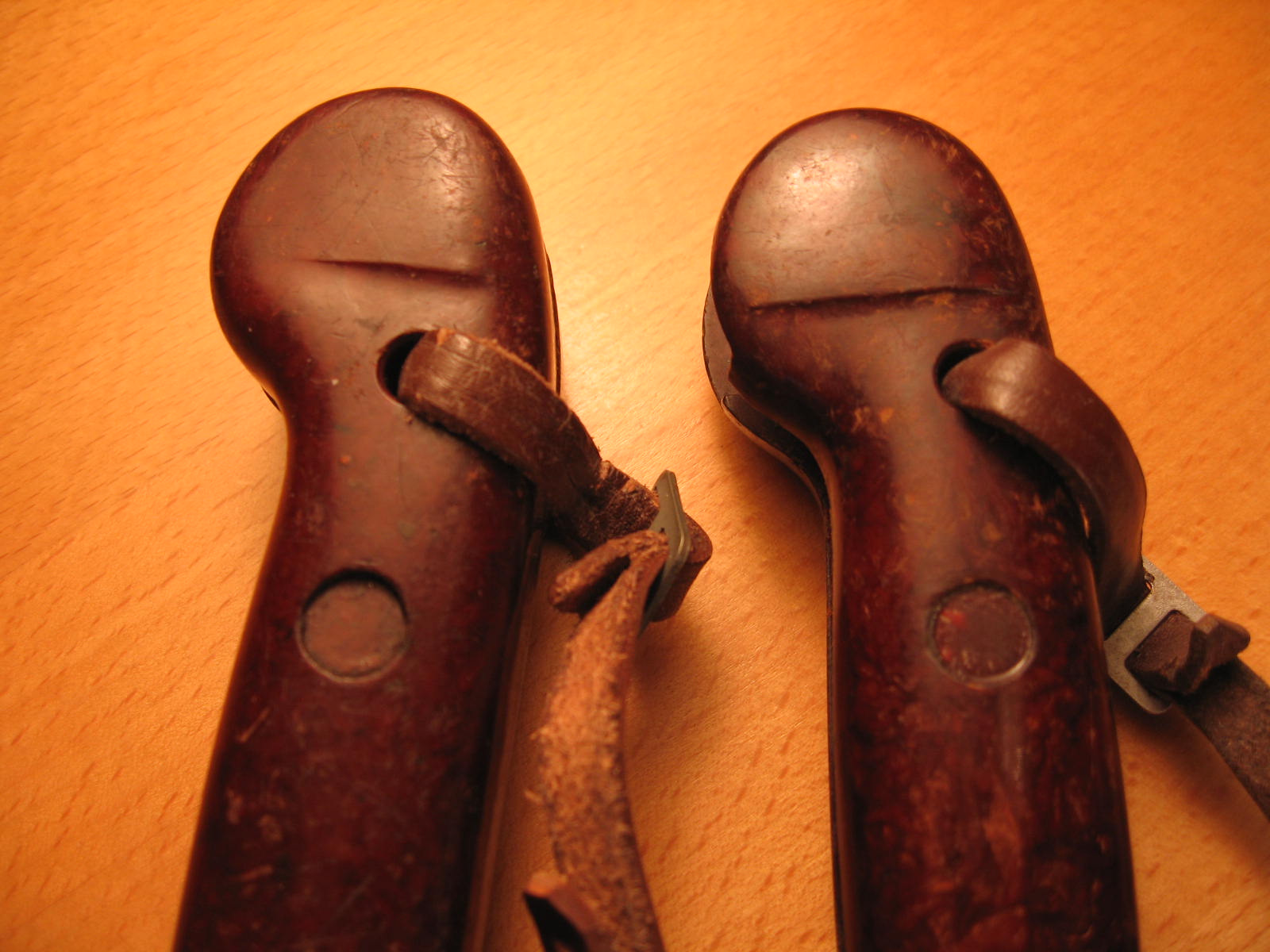 here's one last picture of the left side of the pommels. The ridge around the catch button is round in shape on the GH and more squared off on the latter version. The small ridge on the opposite side is also a different shape. M.