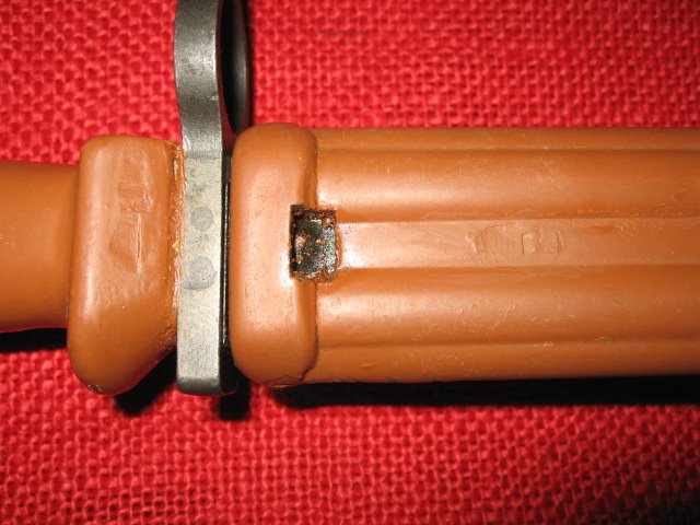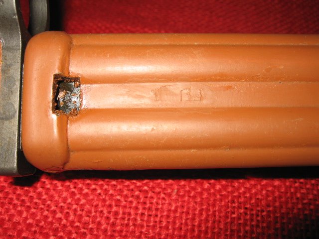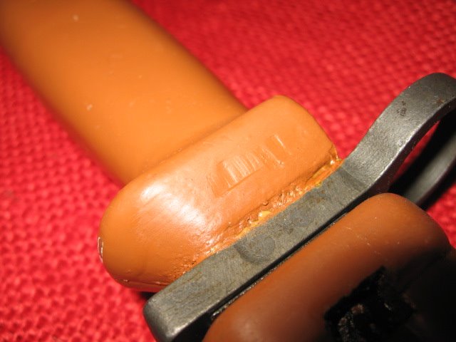 I recently observed an Indian INSAS bayonet and scabbard listed on eBay. As I compared the pictures I found them almost identical except for one thing. The one on eBay had the manufactures marks on both the bayonet and scabbard, mine did not. On closer examination mine appears to have originally had the marking, but they had been removed at some time. It looks like someone obliterated the markings with a hot tool of some kind. Top picture is from eBay listing, the rest are mine. Mike