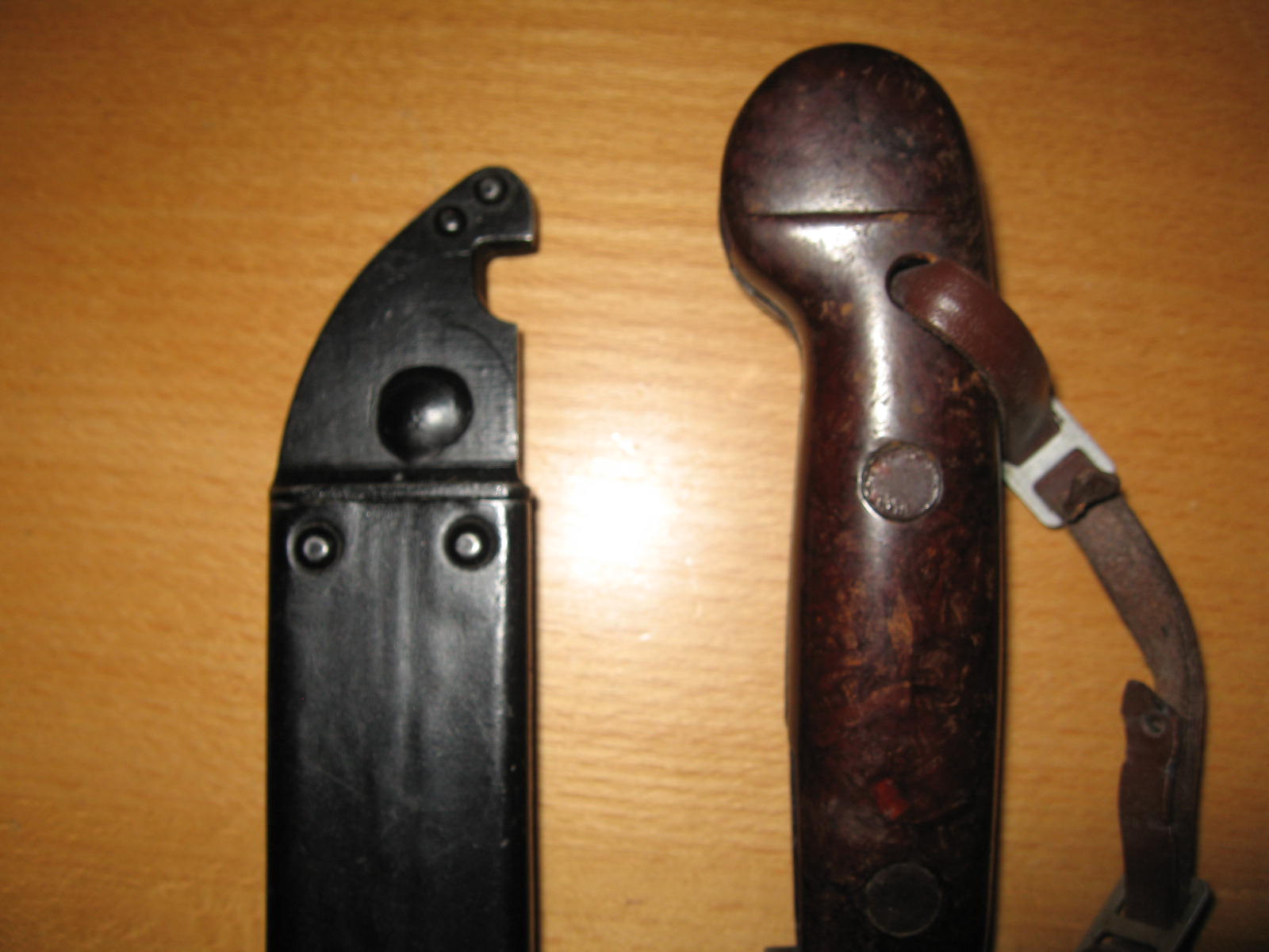 Something else to notice on flat pommel Romanian bayonets as well as the other types. Observe the wear marks on the sides of the cross guards. If there are semi elliptical marks on one or both sides one can tell if that bayonet has been worn with a one or two piece snap hook hanger and not the wraparound style ones. I have six or seven flat pommels in my possession and all of them have had the snap hook wear marks. Hanger are notorious for being switched around, but this is one way to see if the hanger/bayonet combination is "correct". M