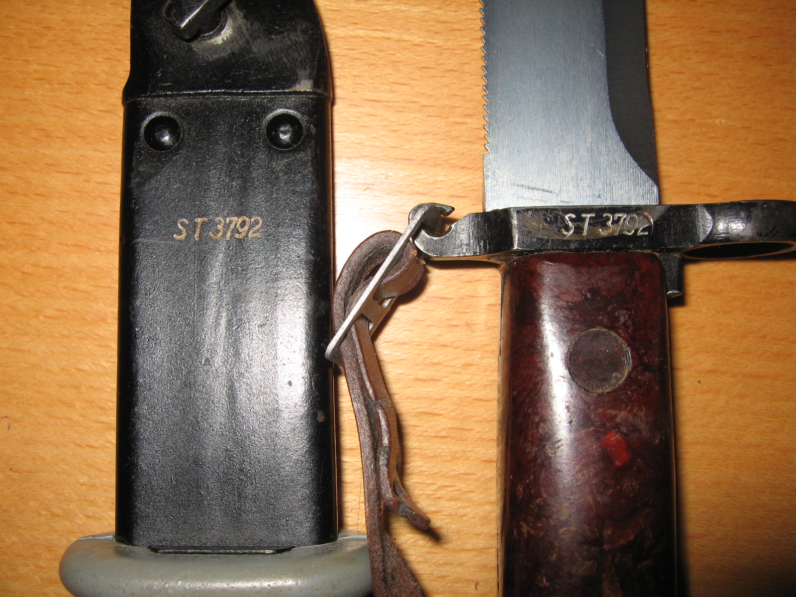 There are actually two different versions of these flat pommel bayonets. They differ in the shape of the pommel and the ridge around the catch button. The one I'll call an earlier version has a GH xxxx serial number. Although the serial prefix does not necessarily indicate age. I call it earlier as it is more used/aged in appearance as well as being different than the other serial numbers associated with the flat pommel, i.e. RS & ST. Also note that the GH has a scabbard that is not painted. Below is my GH and an ST for comparison.