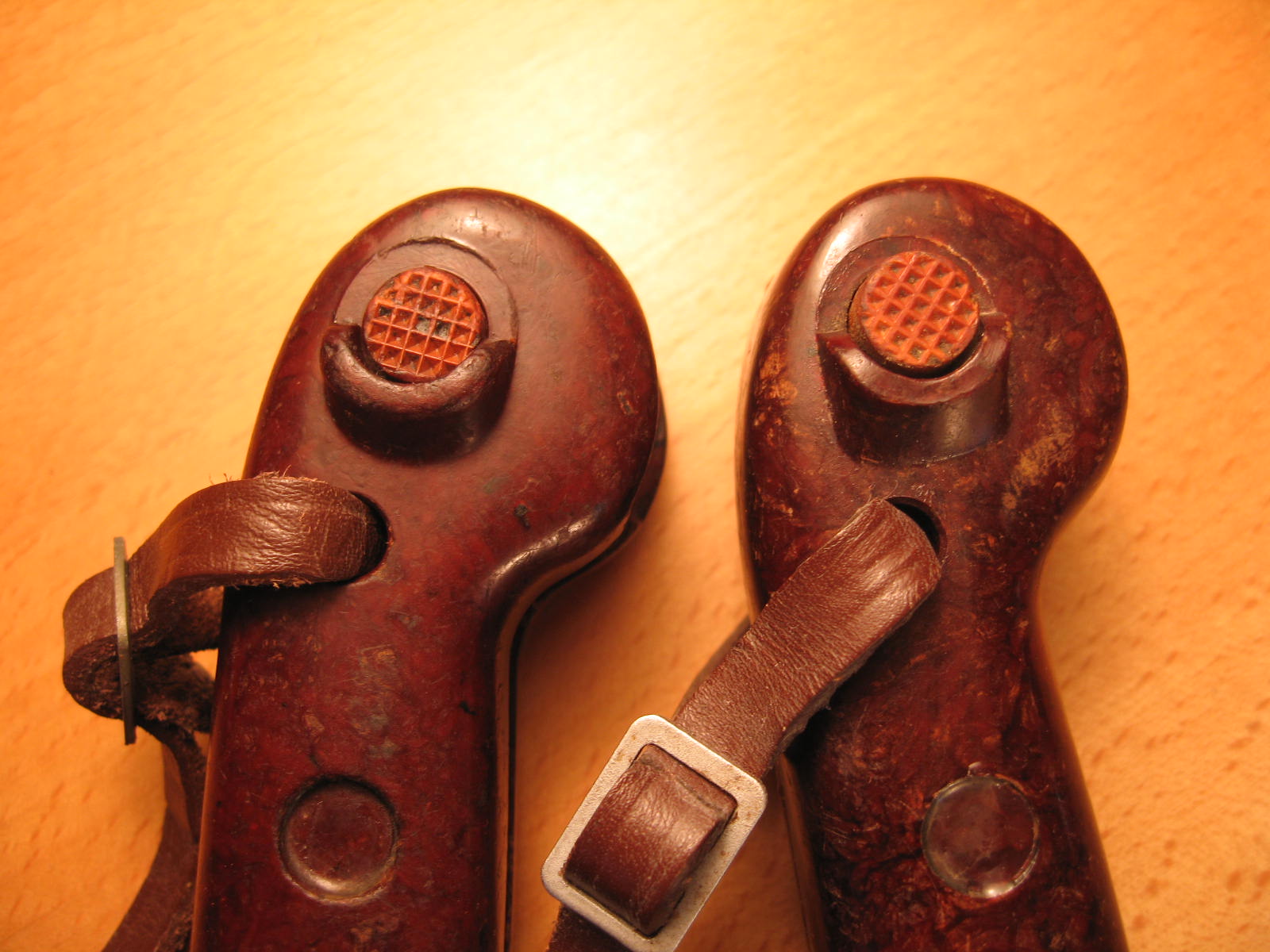 here's one last picture of the left side of the pommels. The ridge around the catch button is round in shape on the GH and more squared off on the latter version. The small ridge on the opposite side is also a different shape. M.
