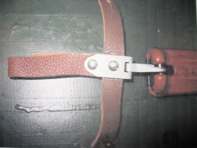 Here is another borrowed picture of the unusual hanger on one of the previous pictures of the Russian 6X5 prototype bayonets. It is shown with a Russian 6X4 Type II scabbard. Also pictures of a couple of my more common standard second type brown pebble hangers for comparison. It appears the flat stamped sheet metal bracket had a couple of small rectangular slots punched out as well as the 4 rivet holes. After the bracket is then folded over a round die, the bracket is then positioned slightly lower on the leather straps before riveting. The small slots are then opposing and provide an attaching point for the snap hook. A savings in material, no "D" ring, and assemble time. This variation would also prevent the bayonet and scabbard from swiveling around so much when worn. For some reason they seem to be quite rare. Never produced in quantity or accepted?