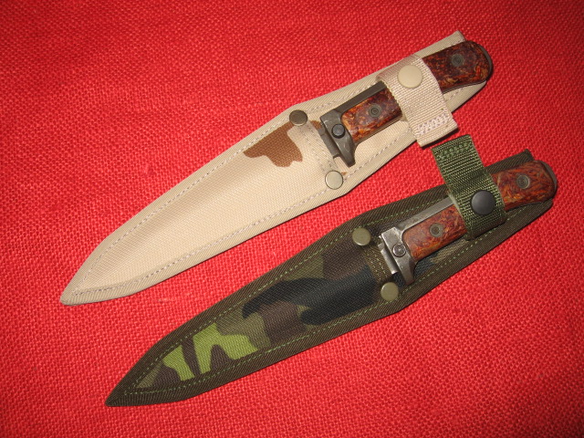 I recently found a picture online that shows some additional variations of this style of Czech VZ58 scabbards. The different "woodland" pattern, second from right, has camouflaged edging and hilt strap were as the first pattern, second from left, had plain color. The scabbard on the far left appears to be designed to hang vertically point up? Mike