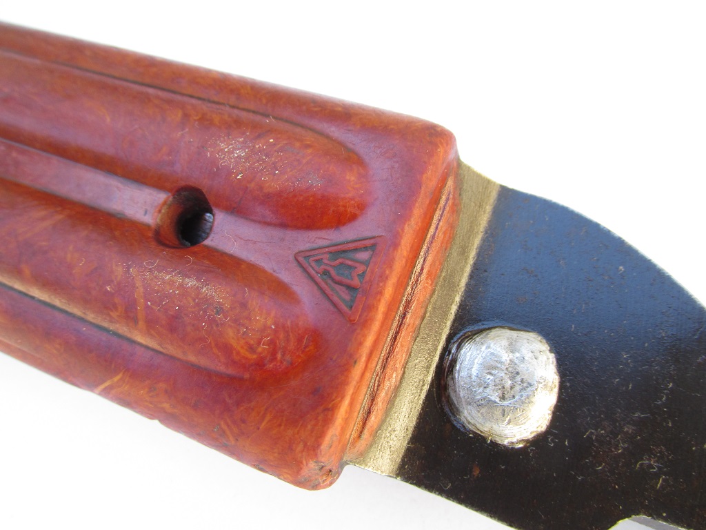 The differences I see between the two are the S.A. one is of earlier production (with grip mold # "1/1"). The grip is a very dark red color, too. The scabbard bears the CUGIR arrow-in-triangle marking on the reverse side. Lastly, the press-stud has a very good fit and the two flats on top of the steel pommel are quite squared off. On the example I pictured here (5854), grip mold # is "3/2". Both flats have a slight bevel from front to back, on the outer edges. There is also a gap at the top of the cut-out for the catch stud (left side). Looks like the top of the stud is a bit shorter rather than the cut-out being oversized. Don't know if this was due to sloppy machining/assembly or more play engineered into the catch.