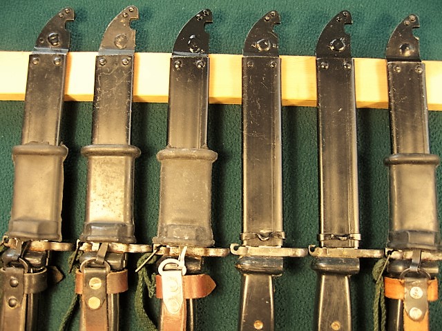 Looks like these pictures got lost. Here are some thing to look for on an Egyptian AKM Type I scabbard. Most have a black or dark grey roughly molded rubber insulator. Some of the earlier ones may be a light beige or gray and are better quality. It is possible that these insulatiors may have been imported from Russia or other ComBloc sources. The scabbards are somewhat crudely made and of poor quality. The bodies are made of flattened welded seam metal tube. The bodies often have many ridges and the welded seam can be seen. The cutter plates are stamped metal and installed with a filler piece to seal the bottom. The rivets are left rounded and protruding. Below are picture of three different time frames of the Egyptian scabbards. Arabic numbered brown grip. English numbered blue/black grip, Unmarked blue/black grip. Mike