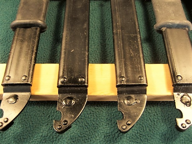 The Egyptians only manufactured AKM Type II bayonets and Type I scabbards on machinery and technology provided by the Soviet Union, (USSR). The Egyptian scabbards are different from most, if not all, of those made else where. They use a stamped steel cutter plate installed in the scabbard body with a small filler piece. Most of the other ComBloc countries used a one piece, machined cutter plate. The scabbard body also is unique as it has lots of lengthwise seriations and a visual seam. This raised seam is usually on the back side near one of the rivets. Unlike other countries that used seamless, extruded tubing to form the body, the Egyptians used welded tubing, hence the seam. M.
