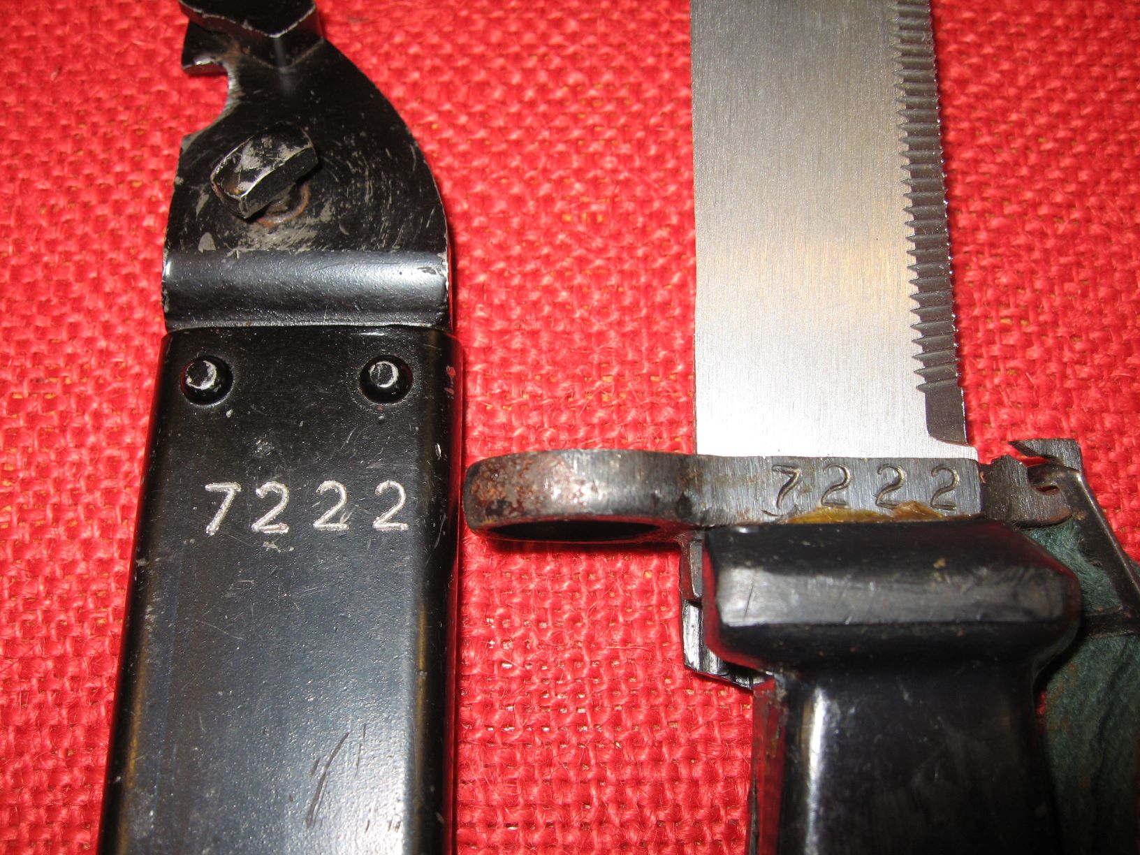 This is a unique picture of Egyptian AKM 6X4 Type II bayonet and scabbard markings. A collector recently posted this picture on another site. The scabbard has hand etched Eastern Arabic numbers. The bayonet has die stamped Western Arabic, (English), numbers on the cross guard. When translated they are both the same. Matching numbers! Mike
