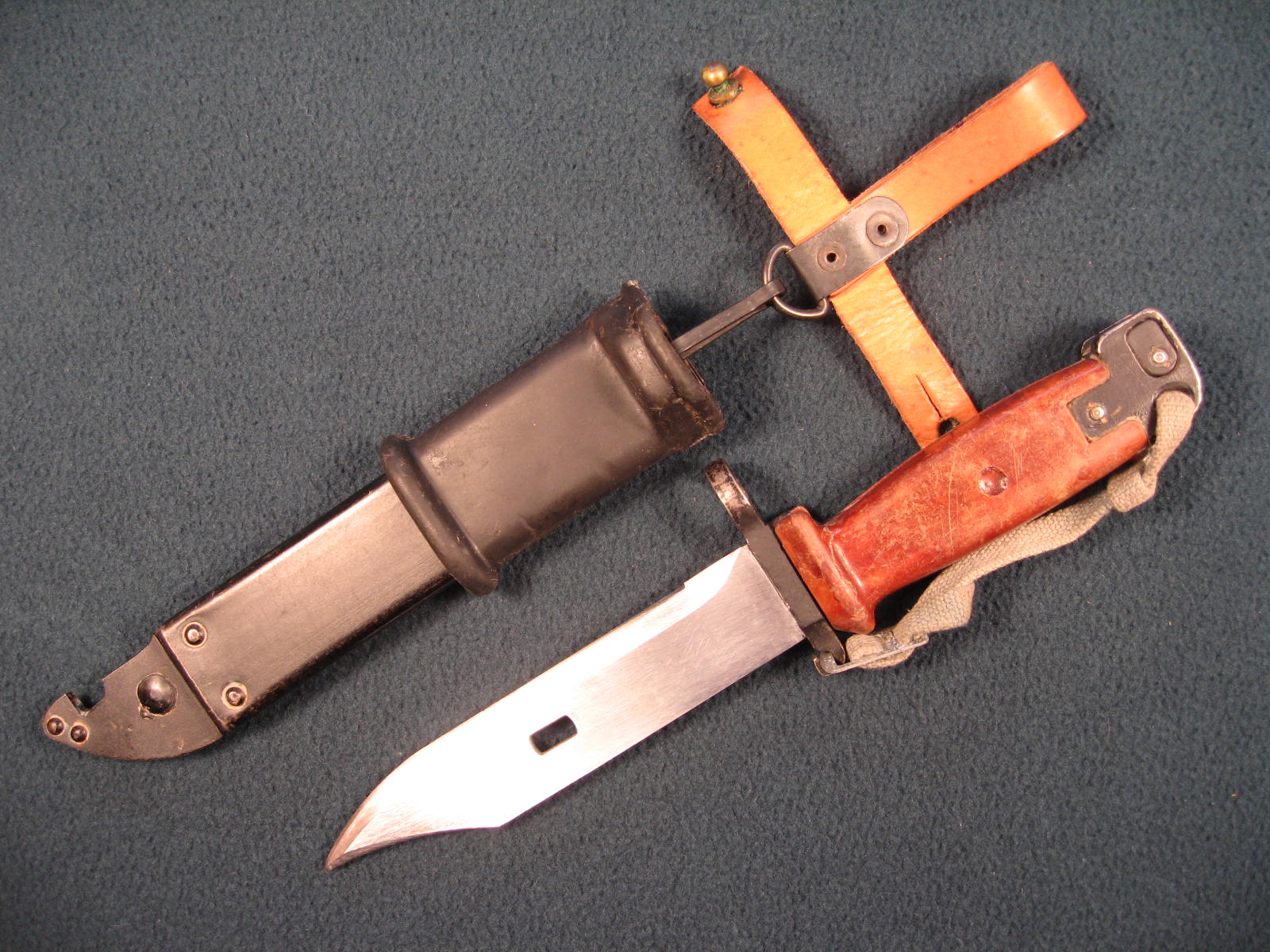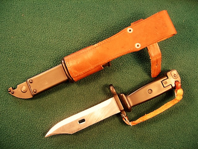 The bayonet in my book has a Polish style blade (no saw teeth) and an odd handle that reminds me of some of the Czech handles on VZ58 bayonets in that it is a red brown color and has what appears to be lots of fiber molded in it. Both the one in my book and the one in my collection have black painted scabbards that are like Maadi scabbards. The bayonet in my book belongd to a friend and didn't have a hanger. The bayonet in my collection has an odd hanger with leather that looks like Maadi leather but it has a snap for closing the keeper strap instead of a stud, the metal is silver instead of the normal Maadi black, and the snap hook is hollow backed like an East German snap hook. The bayonet in my collection also has the typical Egyptian yellow glue all over the grip spaces.