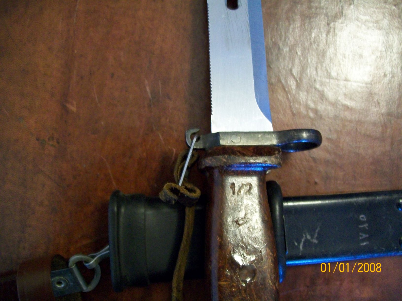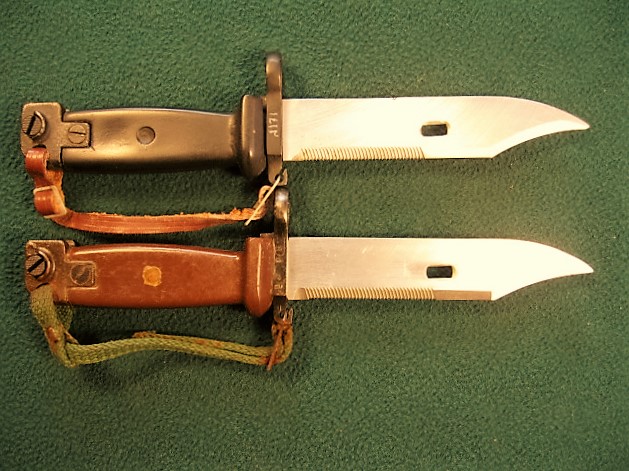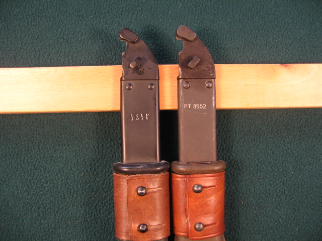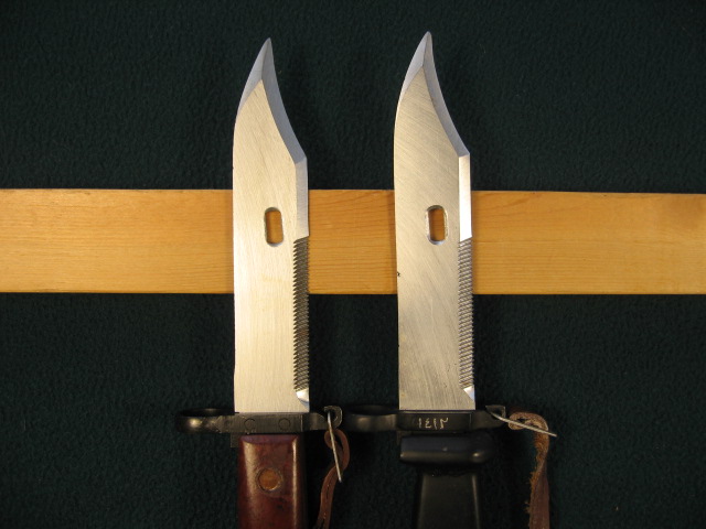 I have tried to compare this mystery bayonet to those from other ComBloc countries production and this is the closest match I have found. Below it is pictured with a Romanian AKM Type I bayonet. Could this be an early attempt by Romania to make a Type II bayonet and sold to Iraq with Type I bayonets? Scabbards match and so do the circular grind marks on the blades. just picked a random Romy for this comparison. Also note the black vs green insulator and the white vs brown hanger stitching. M.