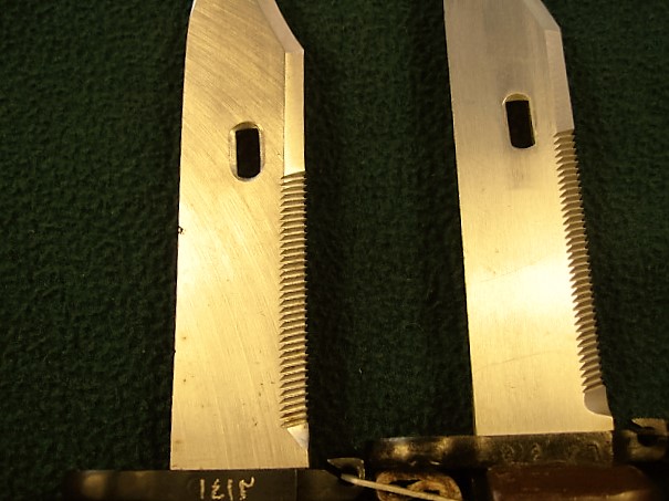 More comparison pictures, Egyptian vs Mystery bayonet. Notice different saw teeth and the straight finish grind on the blade vs the circular marks on the mystery one. The hilt is also missing all the yellow gunk usually found around the grip edges. The scabbard has a smooth body and a milled cutter plate unlike the stamped Egyptian ones. M.