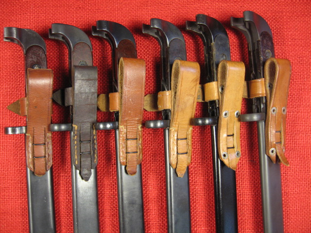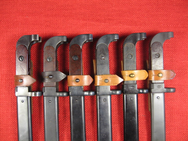 Below are 6 random Polish AK47 bayonets, four 1958 and two 1970 models to show some of the different patterns. Also a close up of the sewn and glued stud covers. Mike