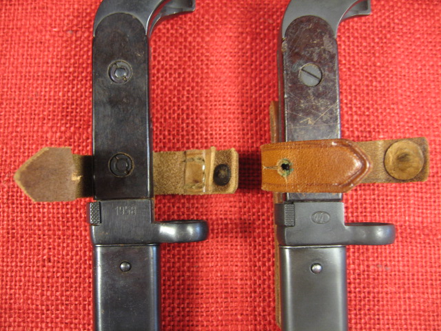 Here is a better picture comparing the differences in the Polish AK47 bayonet vs WZ55 knife hangers. They do not interchange! The arrows show the difference in hilt strap position. They are also different in the hilt strap circumference. The WZ55 hanger is too tight on the bayonet hilt around the locking catch. The higher position of the AK47 hanger on the WZ55 hilt is too tight because of the palm swell. Mike