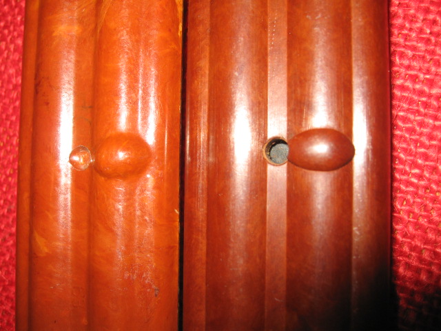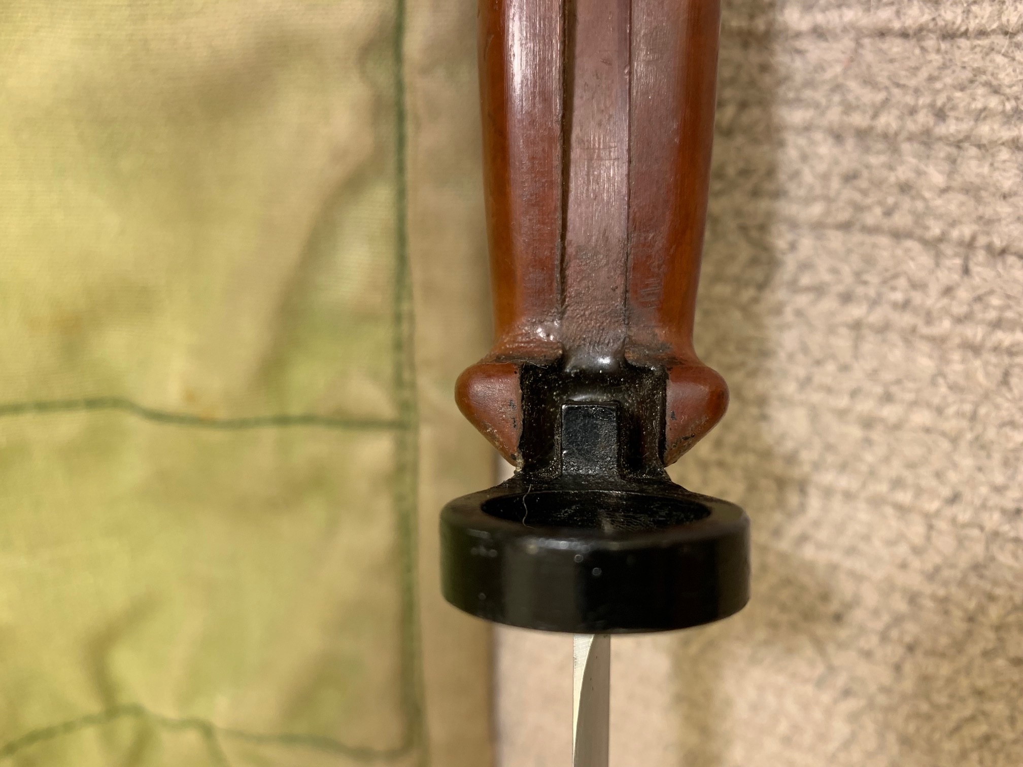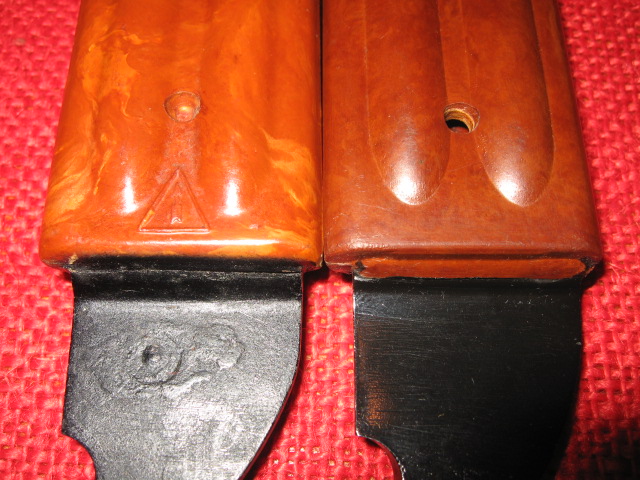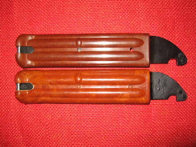 Note that the scabbard ribs are a slightly different shape and definition and molding. The metal cutter plate parts are also slightly different in shape and finish. Another observation is that the grip and scabbard material is a solid brown color and not marbled like the Russian ones. It also has a more "plastic" feel than the material.
