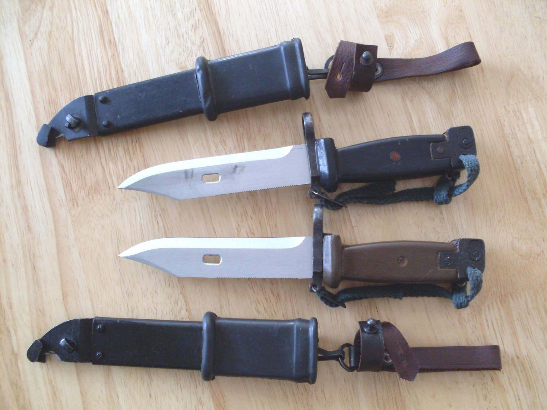 Very nice examples of the two basic types of the Egyptian AKM bayonets. The appear to be complete with the correct hangers and straps which are getting difficult to find. Mike