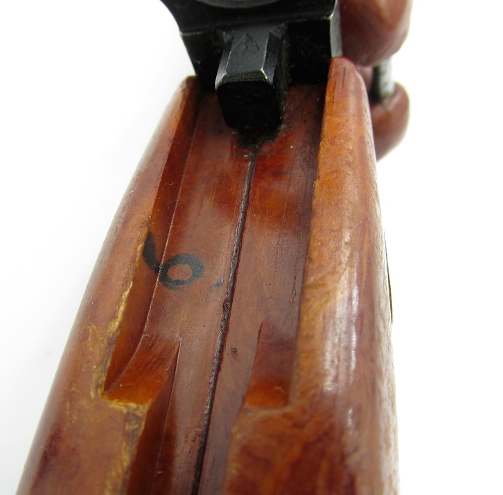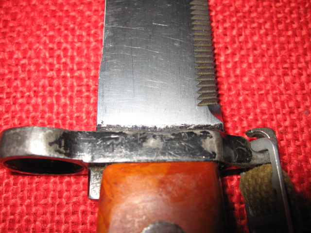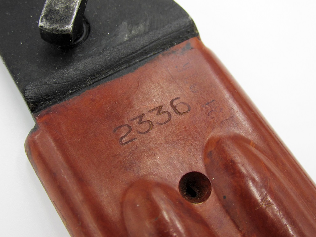 I have two Izzy examples, but both are the result of refurbishment. This is evident by the sloppy, glued screw plugs on the grips of each (and the first one having a etched serial number on the left side of the grip, just forward of the front plug). This bayonet had a original scabbard number shaved off, but interestingly it is a "mold #6". The other bayonet has a etched serial number on the crossguard which matches the unaltered number on the scabbard. However, since the scabbard is "mold #285", this would be a much later refurbishment, with the bayonet matched to either an unaltered scabbard number, or new scabbard numbered to match the bayonet.