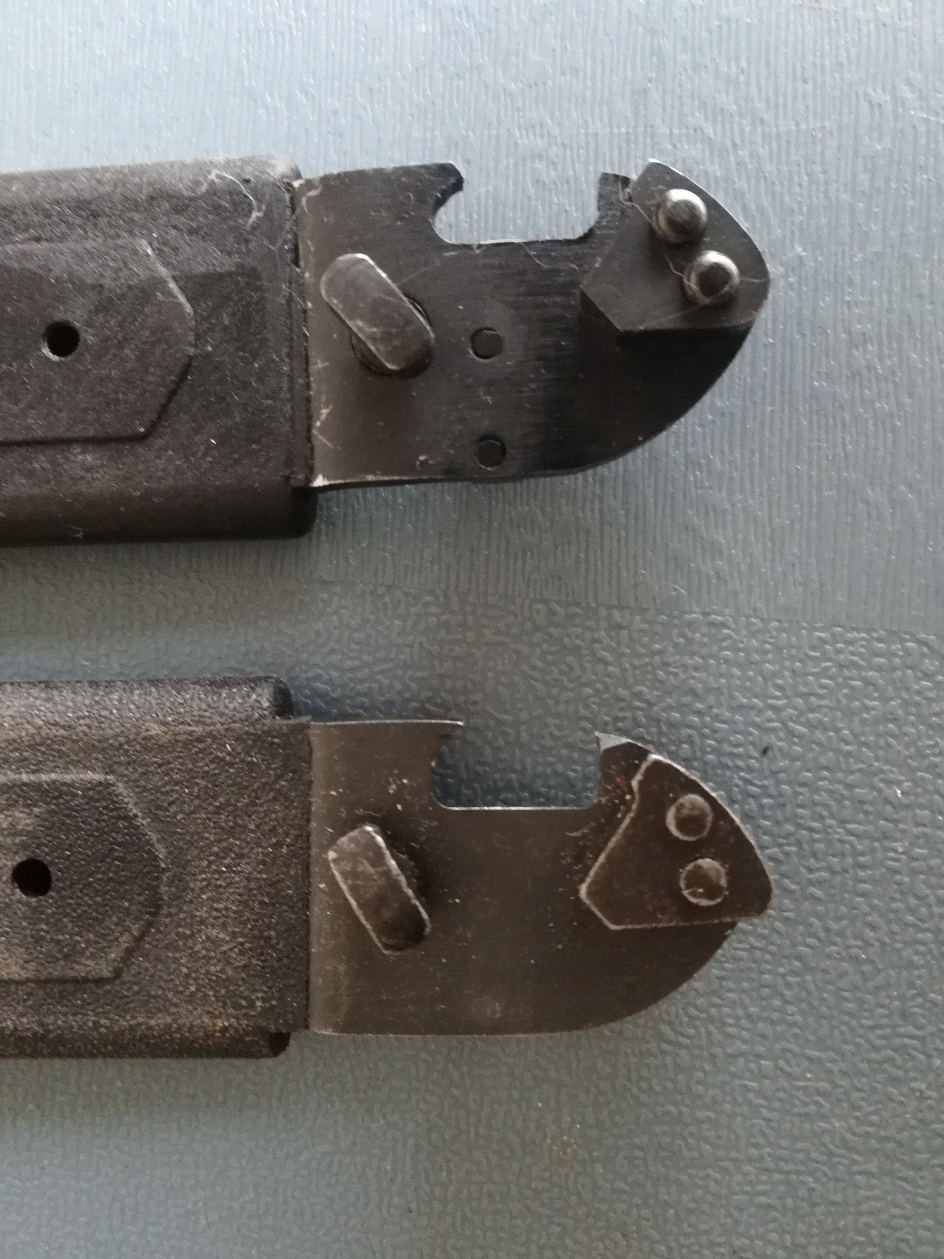 I made a comparison between this model and the commercial version. You will observe that the handles are different (shapes and rivets). The blade is not fixed in the same direction, moreover it has a shape which is not identical. Finally, on the end of the scabbard of the commercial version, there is no sign of manufacture (welding, riveting).
