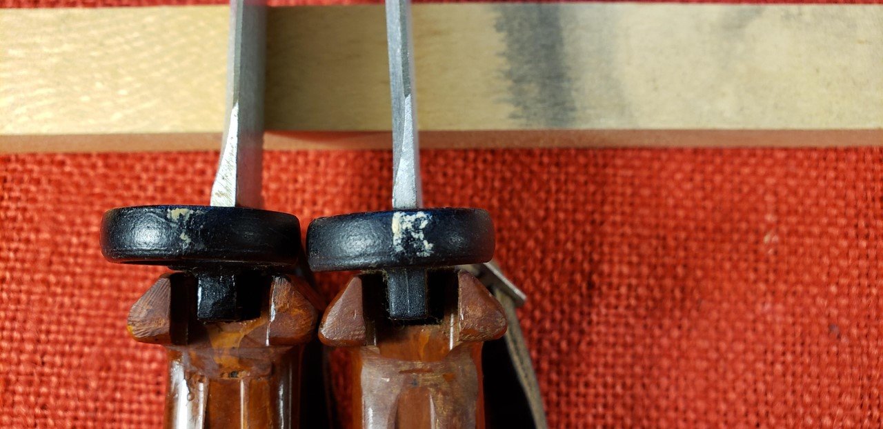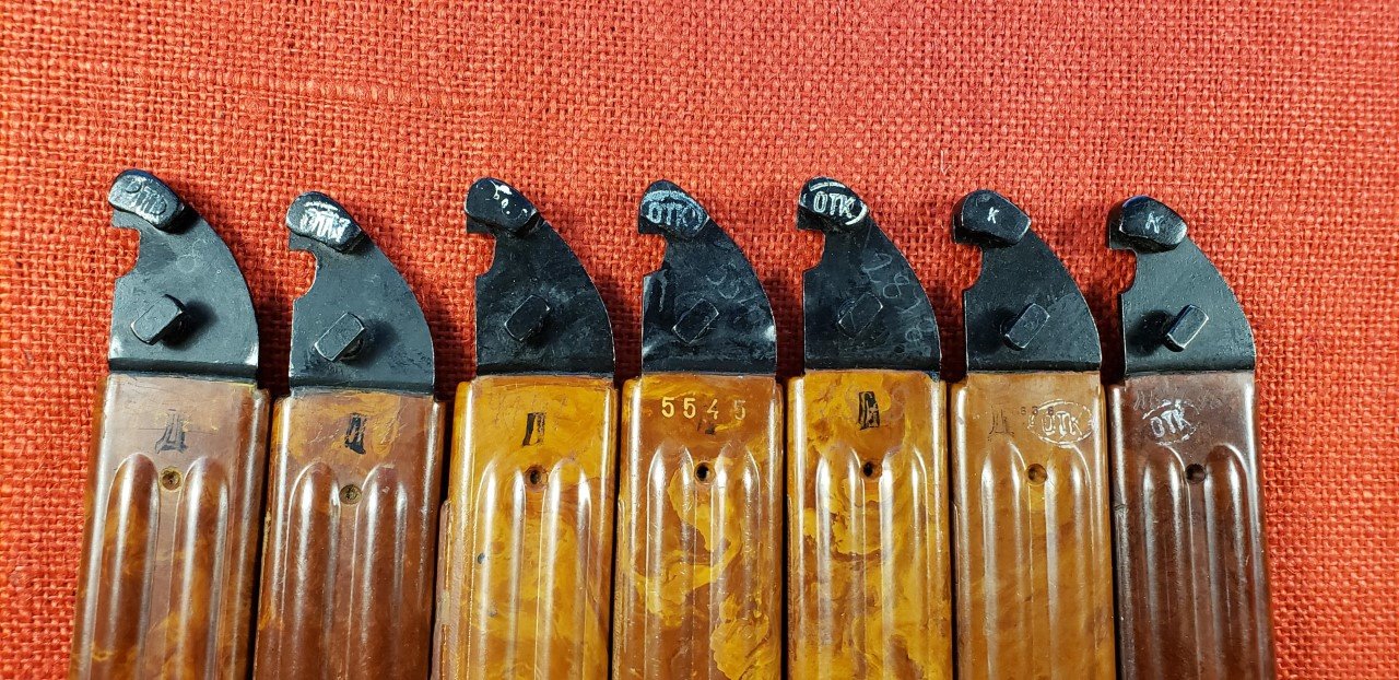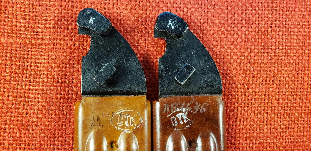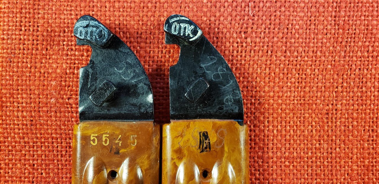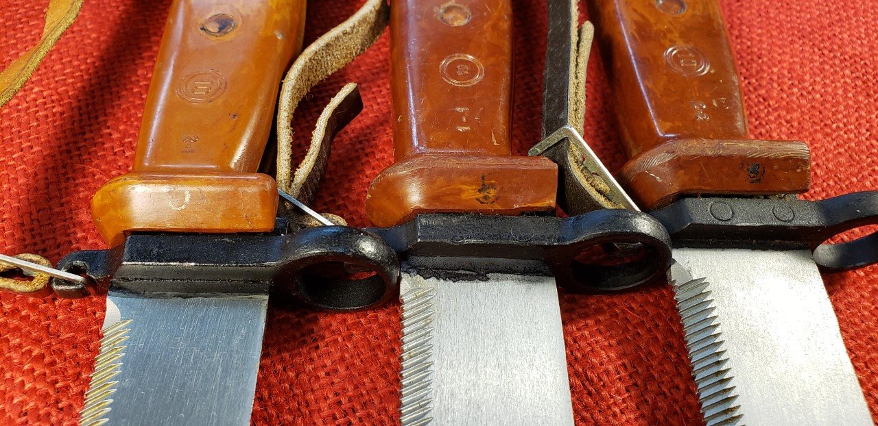 The Bulgarian AKM 6X4 Type II bayonets and scabbards display simple and consistent hand stamped paint or ink markings. These can be from manufacturing and assembly inspection or from military acceptance. I believe the white paint oval OTK and possibly the "K" are military acceptance marks similar to their Russian counterparts. The early scabbards with the flush ground welds on the cutter plate are found with a white "K" on the cutter plate stop and a separate OTK on the lower scabbard body. On later versions the was simplified to just the OTK on the cutter plate stop. Note the two later versions pictured have the hand etched matching numbers on the cutter plate. This is unusual and similar to numbering found on some Yugoslavian akm scabbards. Mike