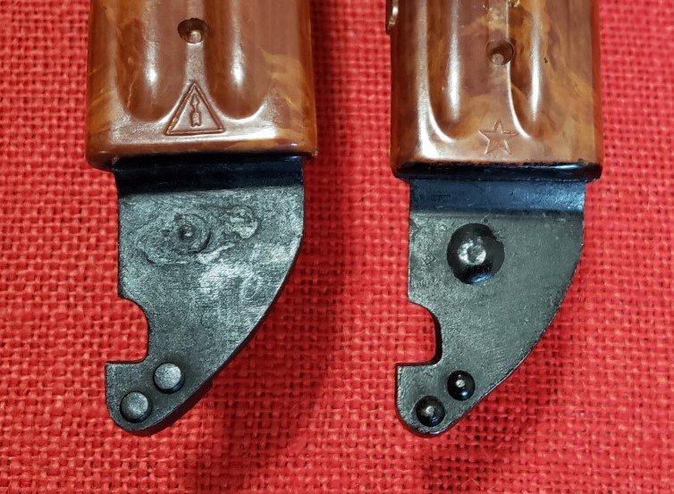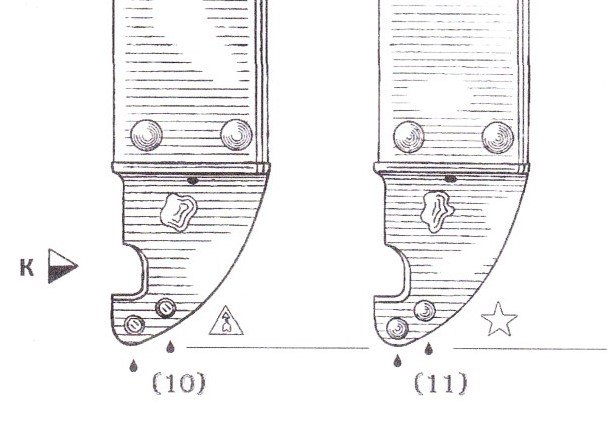 You can identify the scabbards according to arsenals by the rivet heads on the back side of the cutter plate stop. The Izhevsk ones have flattened heads. The Tula rivets have rounded heads. This is true for both the Type I and Type II scabbards. The drawings are from a recent Russian reference book. Mike