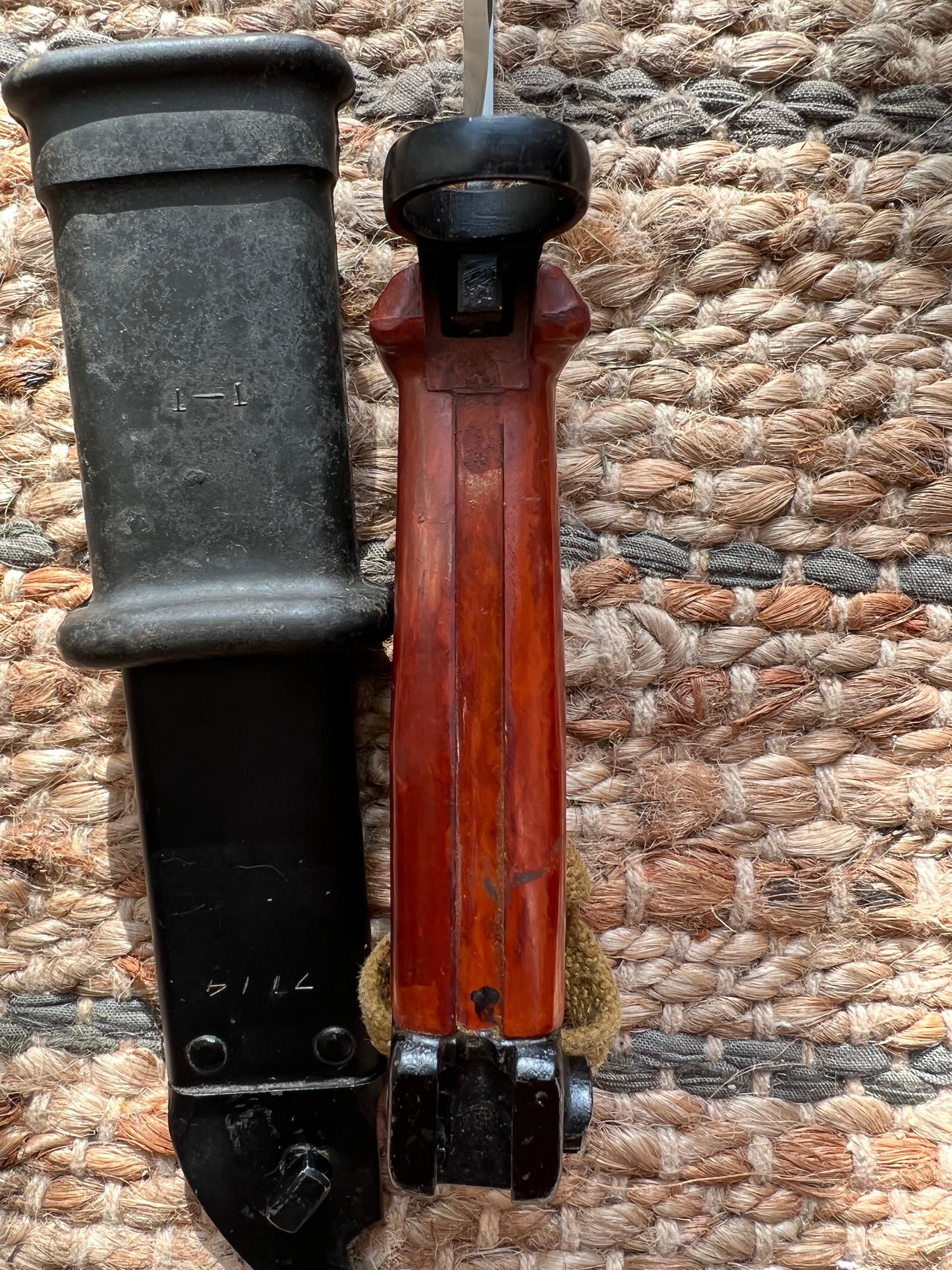 The bayonet is definitely a very early Tula AKM 6X4 Type II with the carried over arsenal mark on the flat behind the muzzle ring. Very interesting markings on the pommel not found on later production. The scabbard is definitely a late version Tula AKM Type I. All the markings and numbers appear correct for this time period as well. The only things I would question would be the insulator and hanger. I would have thought that the insulator with the "T-T" markings was from very early Tula production. Those early markings are rare and were eliminated with simplified later unmarked mass production. To me, the hanger appears to be a more of a universal style usually found as a replacement or reconditioning item on both Tula and Izhevsk bayonets and scabbards. The original Tula hangers in this transitional time period would have been the light tan ones with a flat "D" ring. Just my humble opinion. Mike