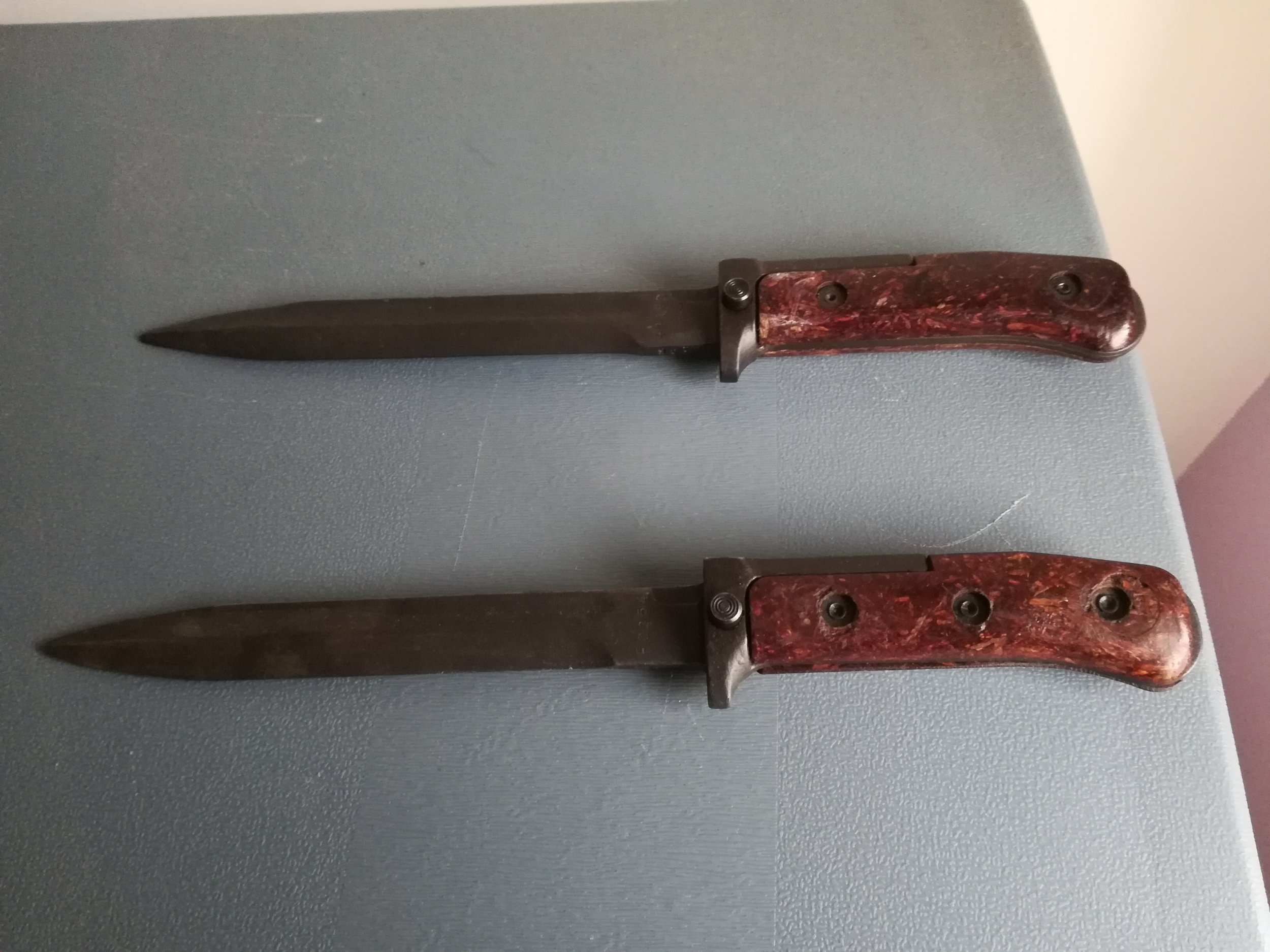 The third picture is very interesting. The top one is a type is a Type I bayonet that has been repaired using flat Type III grip panels and a piece of wood(?) filler where the Type III tang would be in the hilt. All this secured using 3 rivets. The 3 types of VZ58 bayonets only used 2 rivets in standardized placement when new from the producing arsenal / factory.