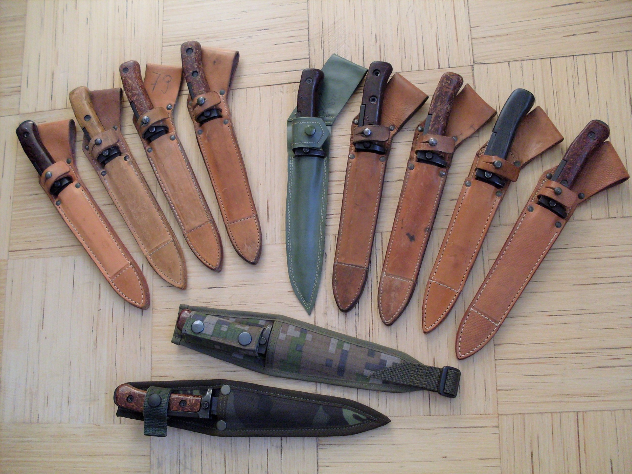 The second picture is a nice group of Type I bayonets with a variety of wood chip grip panels. One appears to be original due to 2 rivets and placement. The others have been repaired or reworked with non-original glue only and /or rivet placement. Most of the bayonets that the Czechs released as surplus are ones that have been inspected, repaired and reworked and placed in reserve years ago. Grip repairs and replacement were only done to be functional with no standardization. Mike