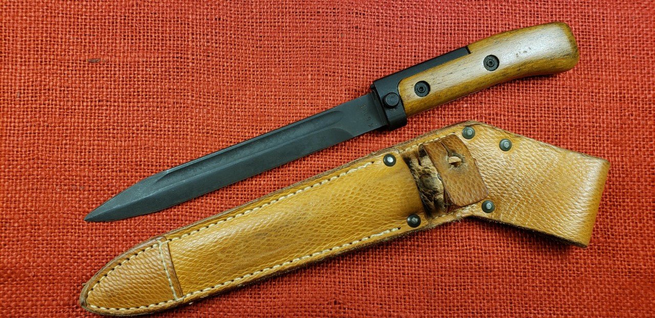I finally found one on eBay. Received it today. Czechoslovakian VZ58 Type I bayonet and scabbard. This one has the official authorized hilt modification. This was done by removing the original grip panels and welding on a pre-formed tang extension. This was ground smooth and then refinished. New Type III grip panels were then installed and riveted in place using authorized rivets and placement. This one is in decent shape considering it was reworked to start with. This completes my collection / display of VZ58 bayonets and scabbards either standard production or with authorized modifications.