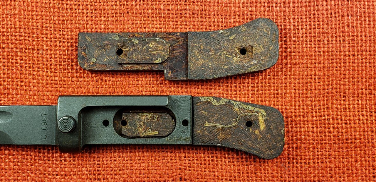 Note that any Type I bayonet without rivets or rivets in different locations is not original. The original and replacement wood grips were supplied pre-inletted and finished. The grip is held in position by the rivets and using the small holes in the metal hilt tang and grip. Also note that they only used a certain style of rivet and setting for ALL 3 Types of the VZ58 bayonets. All other rivets or fasteners are either from emergency repairs or unauthorized. Fakes and replicas are quite common. Mike