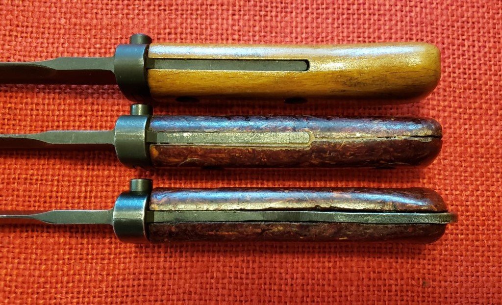 More pictures of the Czech VZ58 Type I bayonet with modified hilt. The bottom two show the differences between the Standard Type I Bayonet on top. Middle is a Type I with Type II grip panels. On the bottom is the Type I with welded on hilt extension and Type III grip panels.