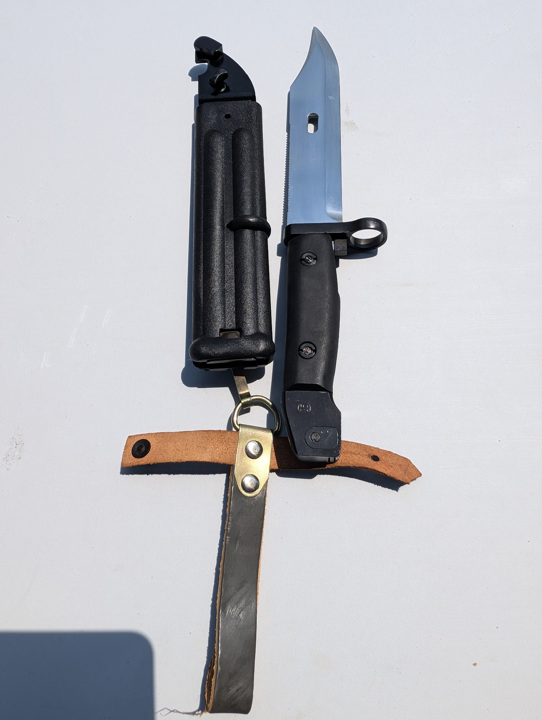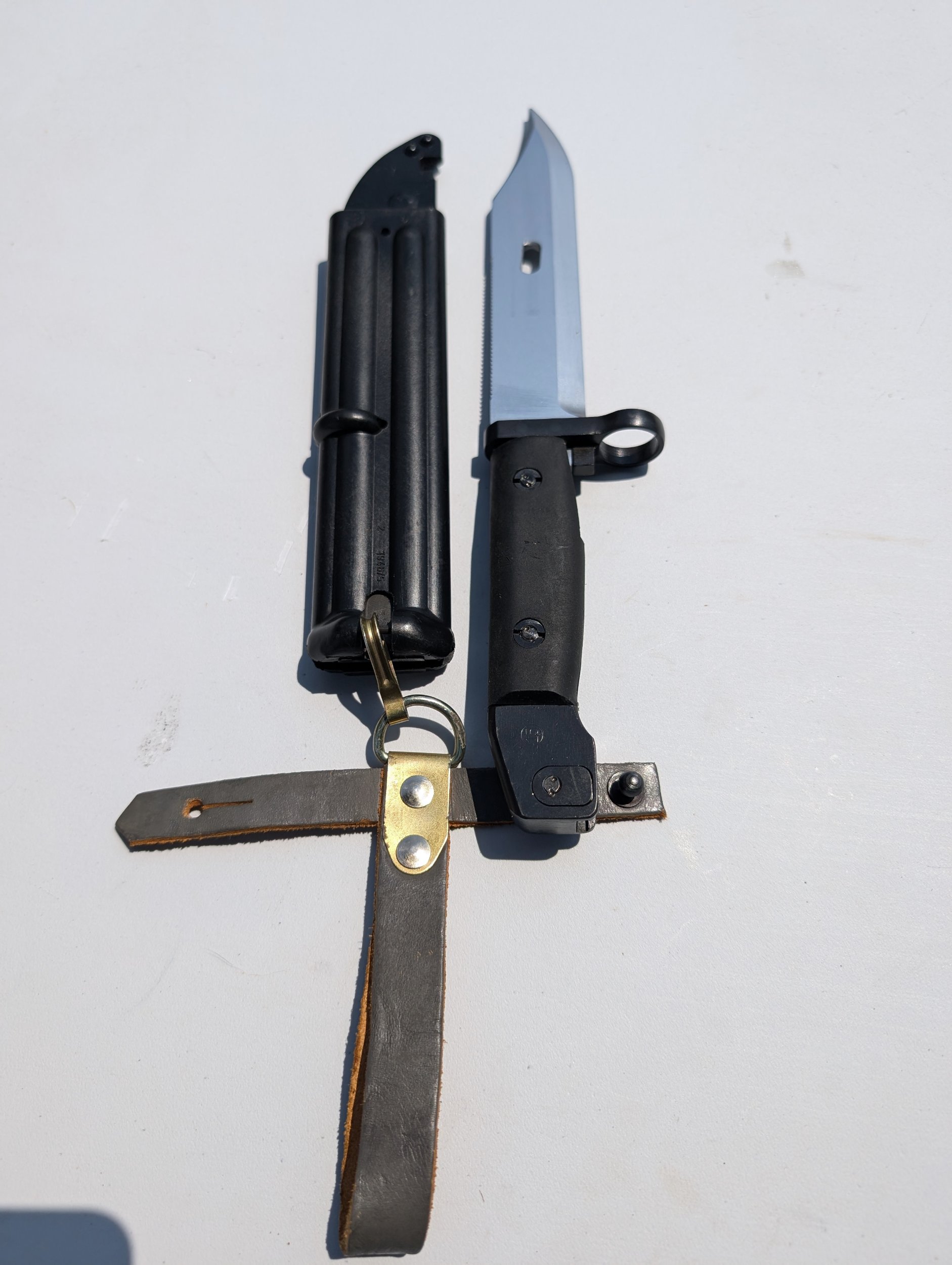 Very nice examples of these two variations, just like mine! It does look like you added a Russian hanger on the brown one. I would suggest replacing it with a short East German, (DDR), one to be correct. Who ever made these bayonets up used new unissued surplus DDR scabbards and hangers assemblies. The black scabbards would be correct with either a short or long hanger depending on if the were assembled for use with the DDR AKM 6X3 Type I, (transitional) or the AKM 6X4 Type II bayonet. This can be somewhat determined by the molded marks on the scabbard, early vs late. Mike