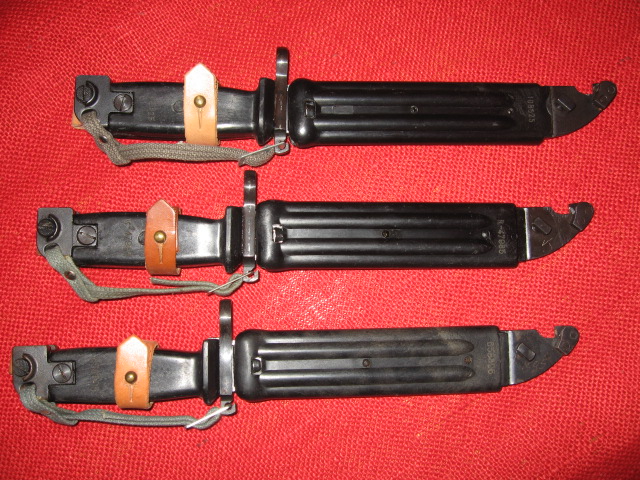 I noticed that there wasn't much info on this subject, so here's a start. There are no references to Yugoslavia having made or issued AK47 bayonets. The same goes for the early AKM 6X3 Type I bayonets. Apparently the only Kalashnikov bayonets made and issued by them is the AKM 6X4 Type II bayonet and scabbard. They are all pretty much the same with only minor detail variations. The pictures below are of three different ones to show one of the most obvious differences, the "R" code numbered series. I have one unnumbered, unissued one but most commonly they have 5 or 6 digit issue numbers, (should be matching), stamped into bayonet grip and the lower part of the scabbard. The only various I know of to this is the ones stamped with a proceeding "R-" this adds 2 spaces to the standard issue numbers. Regardless of the length of the numbers including the "R-" ones they are always centered on the bayonet and scabbard. The 3 items shown below are all are in excellent to new condition and show little if any usage they all have some minor variations by matching issue numbers as well as matching proof or assemble marks on the blade and scabbard cutter plates.