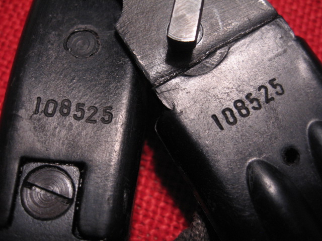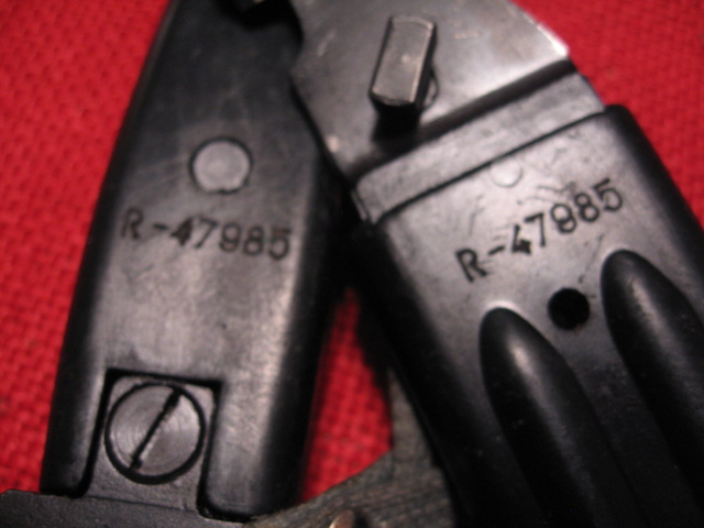I still believe that the matt finished ones that are found in excellent matching condition are a result of a difference in either the material or molding process. The formulation changed and/or less or different coloring dyes used creating a matt grey coloration. The usual molding process creates a hardened smooth exterior skin or shell over the interior material. Like crust on bread. Evidence of this is seen on all the reworked Russian bayonets and scabbards that have been ground on and have new numbers hand etched into the surface. This leaves the softer, lighter colored, interior material exposed. Perhaps by intentionally altering the temp, time, and or pressure during molding they arrived at a more even hardness without the thin, color intensive, outer shell? MIke
