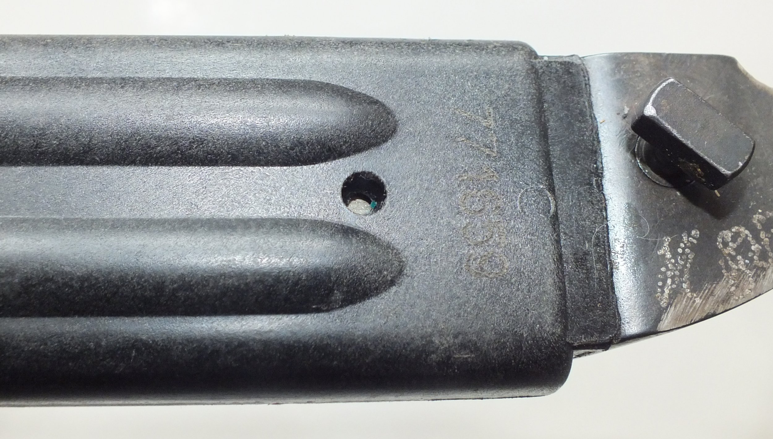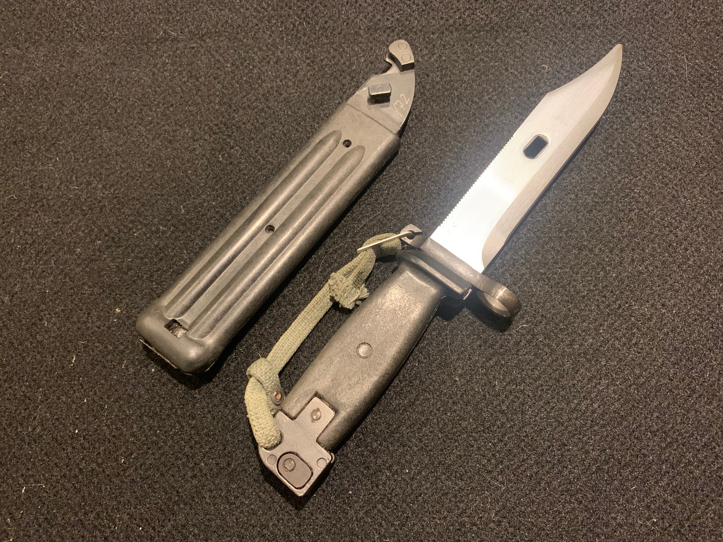 Hi Alexander, I have also noticed several different variations of these "matt" finished bayonets and scabbards over the years. Please observe the one in my collection in the first pictures in this post above. It is not as overall matte as yours, but noticeably different than the other two. I also have an unnumbered, like new, all black M70 pictured on this forum under "Other" - "Slovenian". The un-numbered ones are also hard to find. Note that both our un-numbered ones have the two circular mold marks on the left side of the pommel. I am not sure what that means, maybe just made in the same time frame.