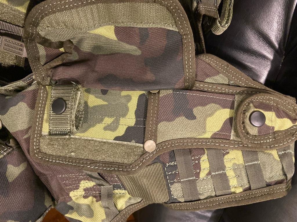 It appears that the conventional belt style of hanger has been replaced by more modern and functional designs. Here are borrowed pictures of more recent Czechoslovakian load bearing equipment. This is a version of a woodland camouflaged vest with an integral sheath for a bayonet or knife. I believe there also may be desert camo and other versions available. Mike