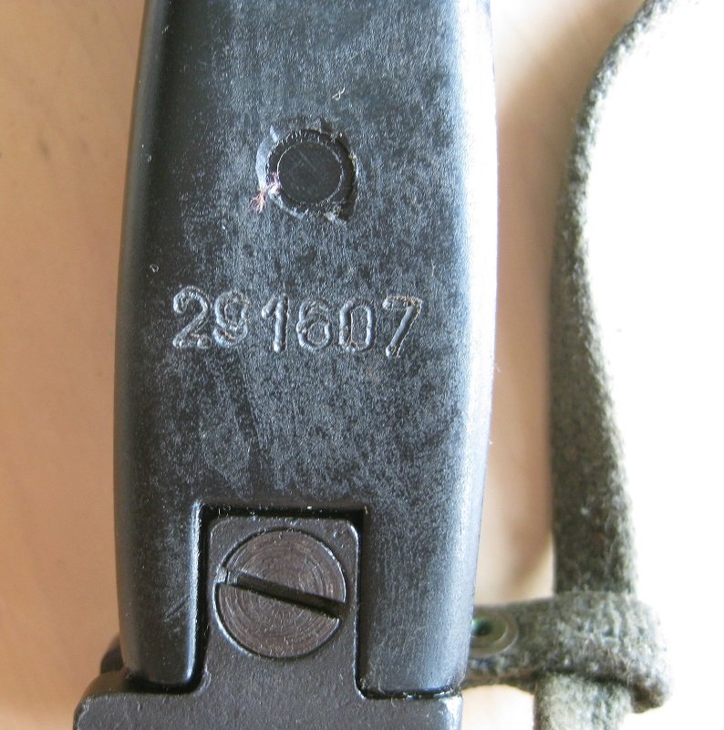 Nice example of a Yugoslavian AKM 6X4 Type II bayonet and scabbard. These are often referred to as a Model 1970, (M-70). From the scabbard details this one is the latest variation. The wrist strap appears to be original and correct. The hanger is not original, but a type frequently found on these bayonets. This is a nice example of a field expedient replacement. Hangers like this appeared during the Balkan conflict and were made and used by various countries. Evidently there was a shortage of original Yugo hangers. Various designs and pieces were used to make up replacements, some were very crude and others like this, were very well done. This one used a surplus pack strap hook in place of the original wire loop and snap hook. The bayonet and scabbard also have nice matching original issue numbers. The hand etched markings on the blade ricasso and the scabbard cutter plate are interesting and are found in some form on almost all Yugo AKM bayonets. They are the final proof and acceptance marks after the pairing of a bayonet to a scabbard and testing the wire cutter function. The production of the bayonets and the scabbards usually does not happen at the same time or even the same place. Once they are paired they can be then be matched with a rifle and the serial numbers are added for storage or issue.