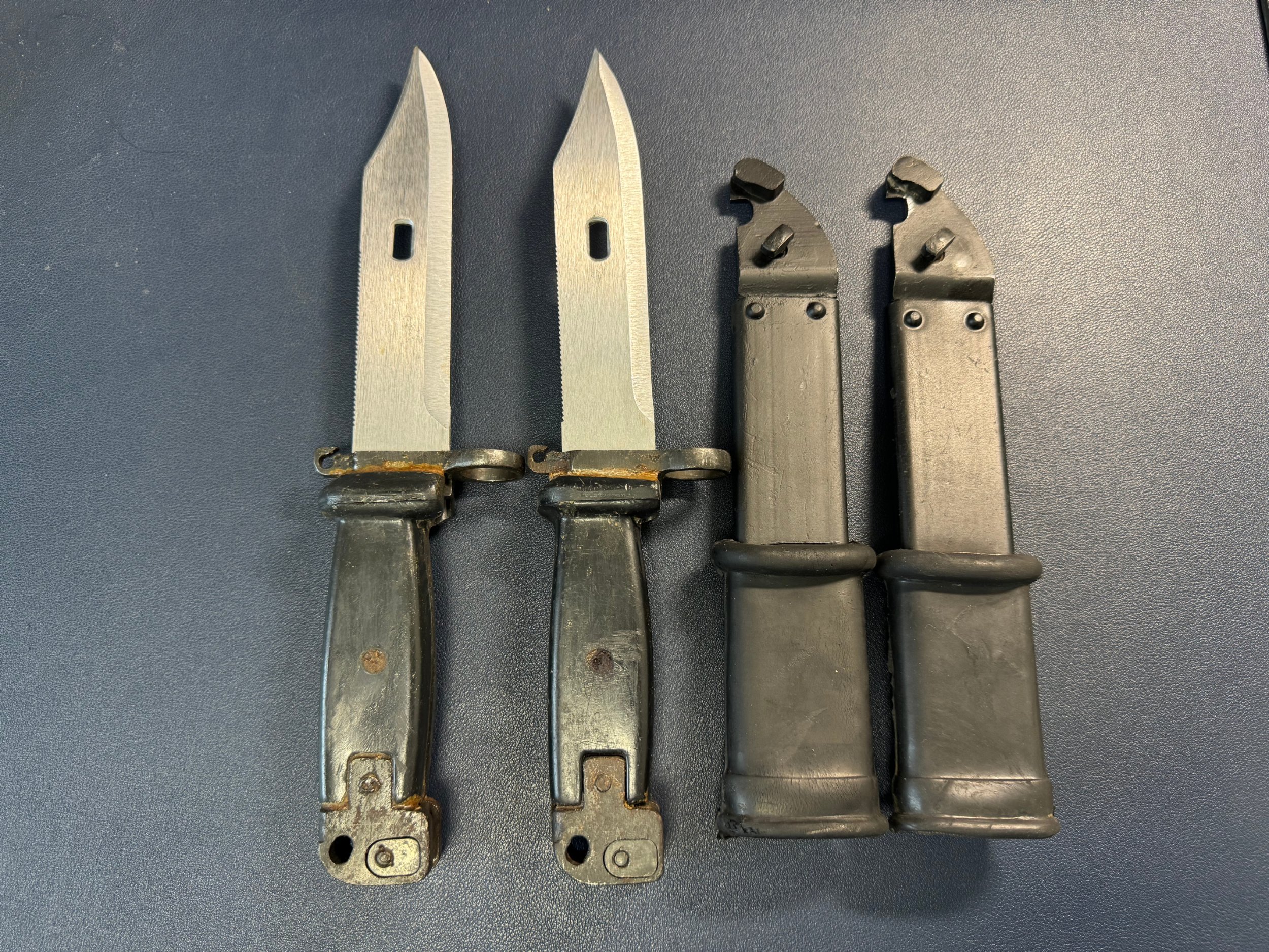 Maybe my eyes are deceiving me, but the rubber scabbard insulator on the left appears longer!? I would be interesting to see the other sides of the bayonets and scabbards. Maybe showing where the insulator stops on the front of the scabbards are located? Mike