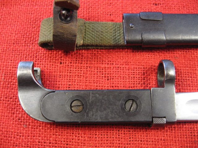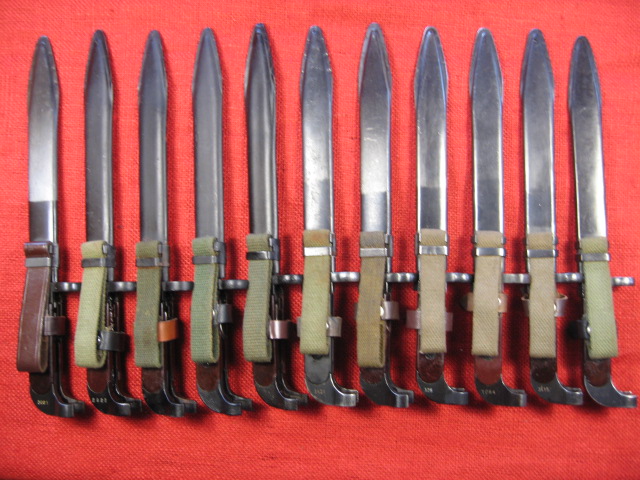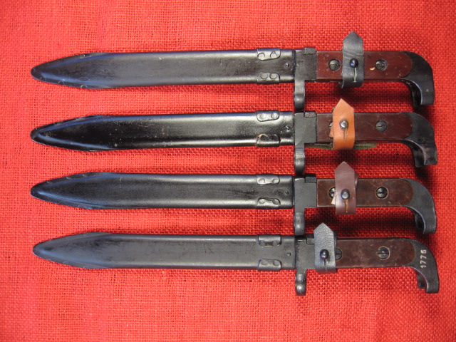 These bayonets could have been manufactured or assembled from parts. Other than the basic placement of the serial numbers, they vary in the size and style of the numbers. The numbering could have been done at any time or country issuing the bayonets. As the scabbards are not numbered or matched to these bayonets they could have been manufactured and supplied separately or mixed at any time and cannot be used to identify the bayonet as to manufacture or issue. Mike