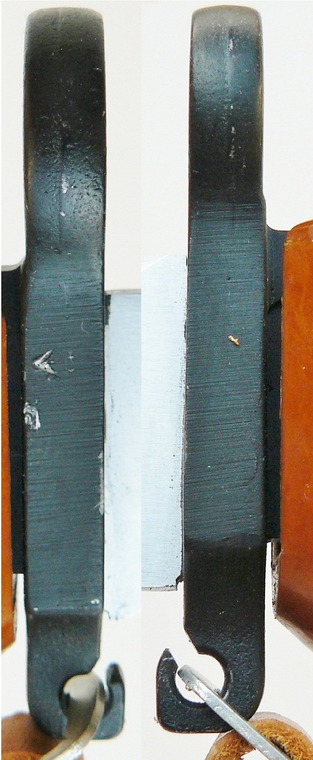 On the 6H4 with the black scabbard, the riveting of the crossguard is cleanly ground flat, the base of the attachment is left angular, very poorly marked with the acceptance mark, and the retaining ring is left with a sharp cast edge.