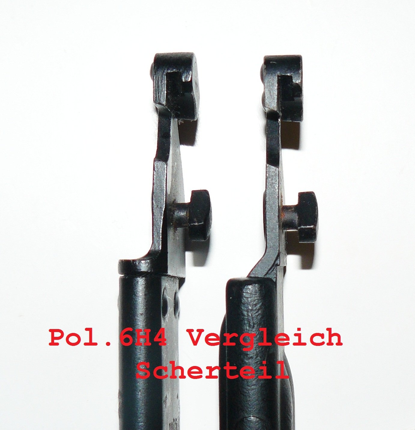 Beim 6H4 mit schwarzer Scheide ist die Vernietung des Parrierstück sauber Plan geschliffen,der Sockel von der Aufpflanzung Kantig belassen , sehr schlecht mit der Abnahme gepunzt und den Haltering mit scharfer Gusskante belassen.