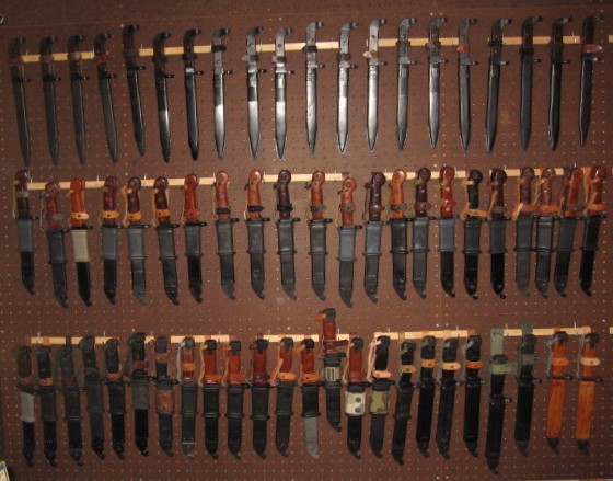 I have a few shadow boxes to display unique collections. Each one holds 3-4 bayonets. I bought them at Michaels and stained them and added dividers myself. The rest of my bayonets are in poly sleeves in ammo crates.