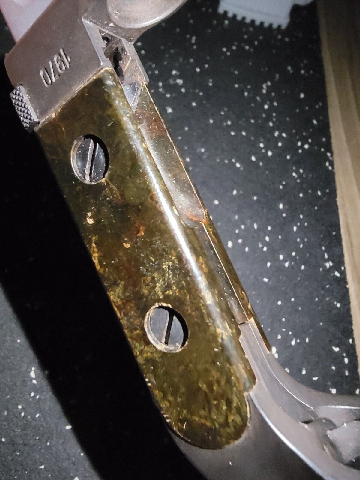 Saw this earlier today and wanted to run this by the group. This is the first time I have seen a green bakelite 1970 bayonet. Has anyone seen these before? Were there any other countries that made green grips for the 6X2 style bayonets and this could be a replacement?