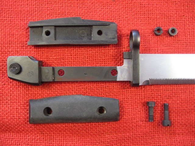 Here are some close up pictures of one of these bayonets disassembled. I don't usually do this and don't recommend it, but my analytical curiosity got the best of me. These bayonets are very well designed and manufactured and of very high quality fit and finish. A small detail I noticed on reassembly is that the heads of the grip machine screws and their nuts are of different thickness and not interchangeable front to rear. This is to make up for the front of the hilt is narrower than the rear. Very over engineered. It would have been much easier and more economical to just use a shorter screw!? M.