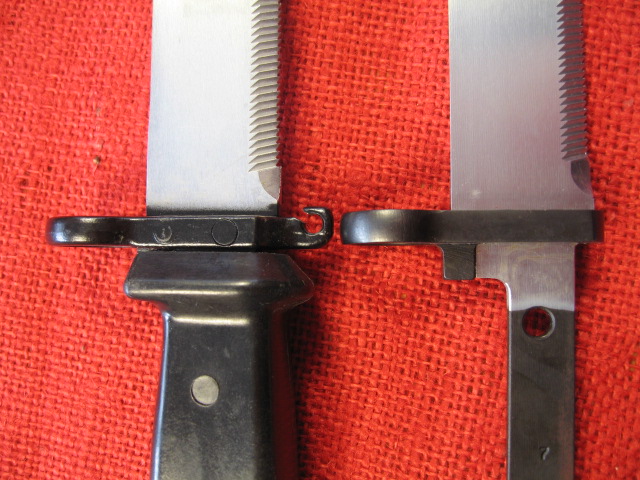 These are a series of comparison pictures between the "Vietnam" AKM bayonet and a East German (DDR) AKM 6X3 Type 1 and AKM 6X4 TYpe II bayonet. The blade tang most closely matches the 6X3 configuration right down to the holes for the grip screws. The Type II blade tang is more centrally located, has one hole and is much shorter, just past the mid point of the grips. The pommel is a completely different shape than the one inside the bulbous Type I grips. It is narrower than the Type II pommel and has a different shaped catch, oval vs flattened on one end. Also note that the release button does have the DDR circle pattern, but no slot. M.