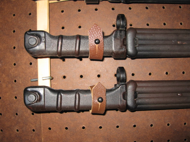 The original hangers are the standard brown pebbled leather. Loris was referring to fact that the bayonet in the first pictures has a black pebbled leather hanger which is probably a later hanger. I hope to have more intimate knowledge in a week or so of this bayonet.