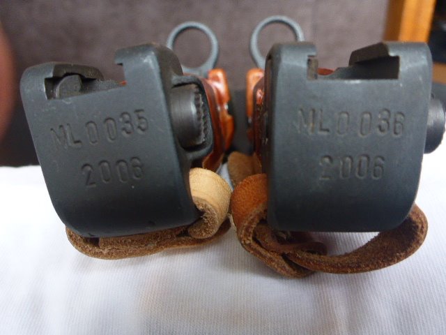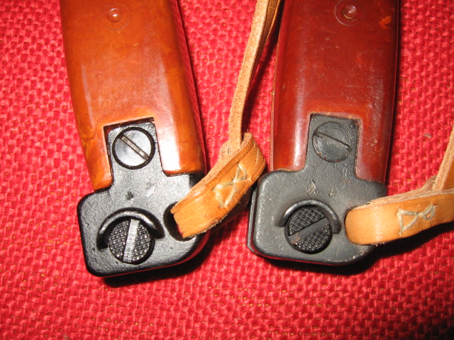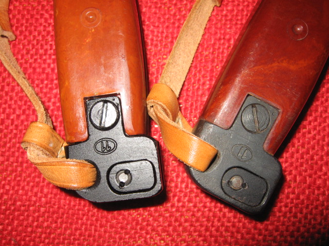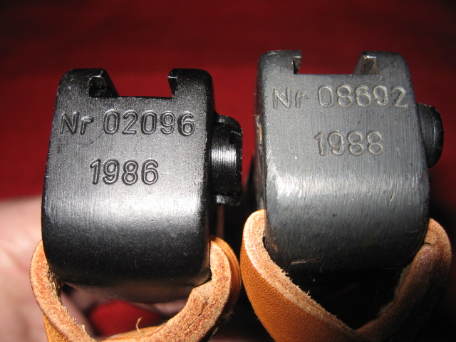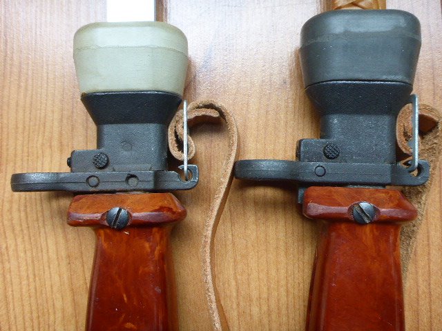 I currently only have two of these Polish trainers. My goal was to keep and display only two representative samples to display most of the main variations, as other than marking and colors, they are pretty much the same and some what expensive. There seems to be only one major change in the metal parts and that is the extra rivet hole in the cross guard, which was not used, disappeared sometime in 1987. In SIG_551_SWAT's 2nd picture above it seems this happened between Nr 3391 and Nr 4371. It is unknown if there is an actual cut off number or if this was a running change as old parts were used up. Another difference is the metal finish, blued or black painted. There are also differences in the head sizes of the small screws at the front of the grips to the cross guards. There are also different colors/shades in the grips from orange to dark brown just like the actual bayonets. Most obvious are the different shades of the rubber collars and tips from white to black. These rubber parts are easily replaced and switched around. Below are my 1986, (light colors, painted), and 1988, (dark colors, blued).