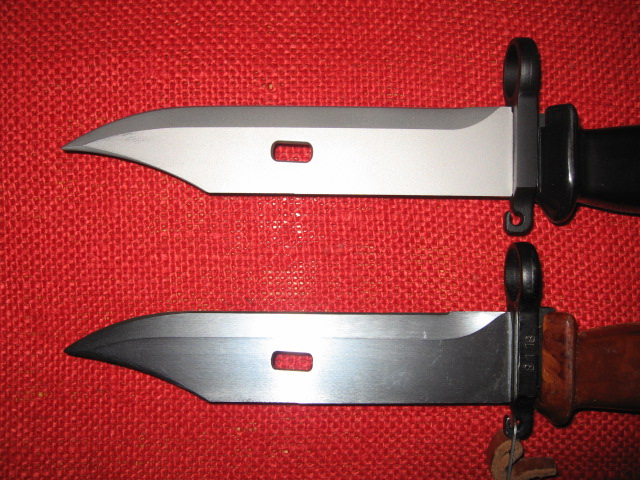 Agree, something new and different. Some observations after studying the pictures on GB. 1. The upper part of the blade tang does not extend through the cross guard as on the previous 6H4 version. This is what creates the flat, or pedestal behind the muzzle ring on the older ones. It's function was to engage a slot on the muzzle attachment and eliminate rotation of the bayonet on the barrel axis. No longer needed? 2. The top front of the black molded grip is a completely different shape in this area behind the muzzle ring as well. The grip seems to be a much more detailed plastic molding without any trimming or grinding. 3. Also noticed there are no plugs or indentions on the sides of the grip. These plugs covered the machine screw or pin that secured the grip to the blade tang. No longer needed? Different method used? Just adhesive or molded in place? Mike